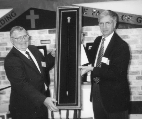 Rev. Gallmeier and Dr. Cedel, President of Concordia University, with Dr. Studtmann's walking stick. This photo was taken at a sesquicentennial folk celebration at Concordia in 2004